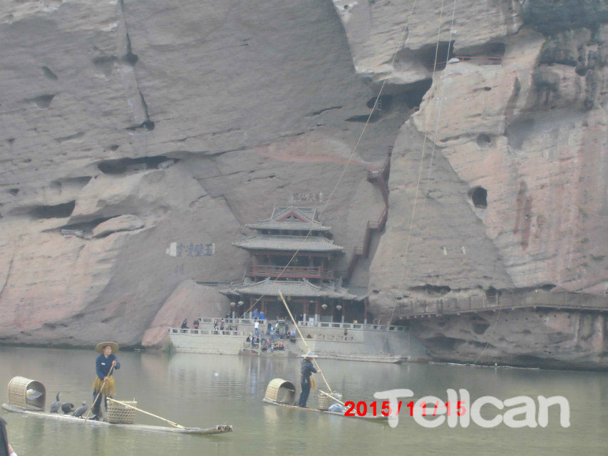 因?yàn)橐惶斓臅r(shí)間比較趕,吃完中餐我們又馬不停蹄的前往龍龍虎山的重要景點(diǎn)去光看懸棺表演,下午2點(diǎn),我們期待的重頭戲就要開(kāi)場(chǎng)了,這就是仿古懸棺吊棺表演。我們從觀景河岸向?qū)γ嫱?,只?jiàn)對(duì)岸的仙水巖峭拔陡險(xiǎn),巖壁光滑平展,巖腳下便是瀘溪河,臨水懸崖絕壁上市滿了各式各樣的巖洞,隱約望見(jiàn)還有些巖洞口或釘木樁,或封木板,據(jù)說(shuō)以前每個(gè)巖洞都放有棺木,這就是崖墓,或稱(chēng)為懸棺,距今已有2600多年,龍虎山的崖墓堪稱(chēng)中國(guó)一絕。這時(shí),飛云閣里的配音解說(shuō)響起,告訴我們:崖墓葬是古越、僚人特有的一種喪葬形式,也是我國(guó)多種葬法中最古老、最特別的一種喪葬形式。古人經(jīng)受了太多的戰(zhàn)爭(zhēng)和災(zāi)害之苦,夢(mèng)寐以求的就是寧?kù)o和太平,先輩的遺愿選擇了將祖先安葬于凌空絕壁之上的崖葬,讓祖先在一個(gè)青山懷抱、碧水環(huán)繞、寧?kù)o幽美的環(huán)境中得到永遠(yuǎn)安息。當(dāng)時(shí)的人堅(jiān)信:“彌高者以為至孝,高葬者必有好報(bào)”,他們就把祖先的棺槨抬上溪流邊陡峭的絕壁,放置在幾乎與水面垂直的天然巖洞中,久而久之,就形成了獨(dú)特的懸棺景觀。