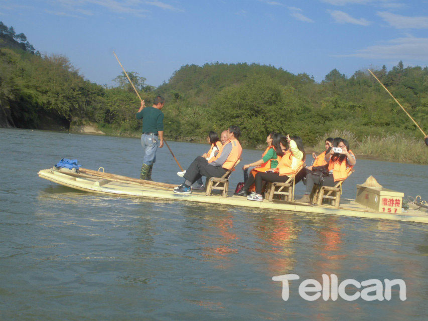 看完升棺表演,我們乘坐景區(qū)內(nèi)的公交車(chē),再轉(zhuǎn)景區(qū)內(nèi)的小火車(chē)來(lái)到蘆溪河竹筏漂流碼頭,由于每條竹筏只能上8個(gè)人,大家分好組后,就紛紛登上竹筏,因?yàn)槭琼樍鞫?,每條竹筏上有兩位船工主要是用長(zhǎng)長(zhǎng)的竹桿控制方向。我們的竹筏剛駛?cè)牒用?,遠(yuǎn)處一條小小的竹筏便朝我們劃了過(guò)來(lái),只見(jiàn)窄窄的竹筏上,坐著一位婦女,一邊雙手努力地劃著,一邊朝我們不停吆喝叫賣(mài),到了跟前才看清,她面前放著一個(gè)小爐灶,灶上面的鍋里是“炒雞蛋”, 小竹筏上還擺放著當(dāng)?shù)赜忻摹鞍謇豸兆印奔捌渌男〕?,船工說(shuō),這是“水上超市”。河面上有七八條竹筏,再加上“水上超市”的小筏子,一路上船夫給我們講解地貌典故,妙趣生動(dòng),與山水交相輝映,真是十分壯觀。